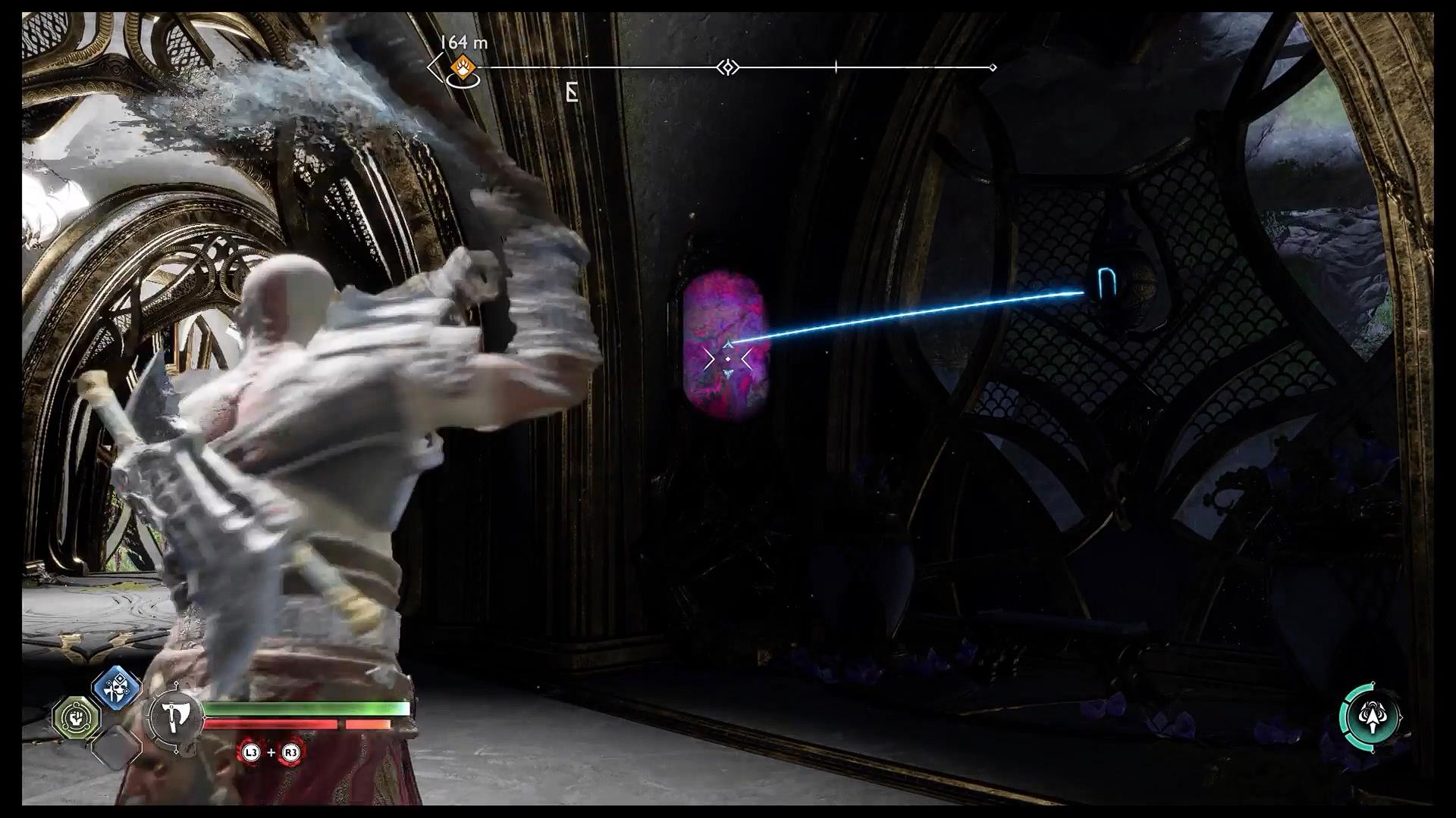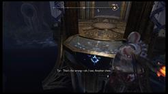 When using the Blades of Chaos on the hook to head to the area cross while resolving the Nornir Chest, turn left to find the writing on the wall.