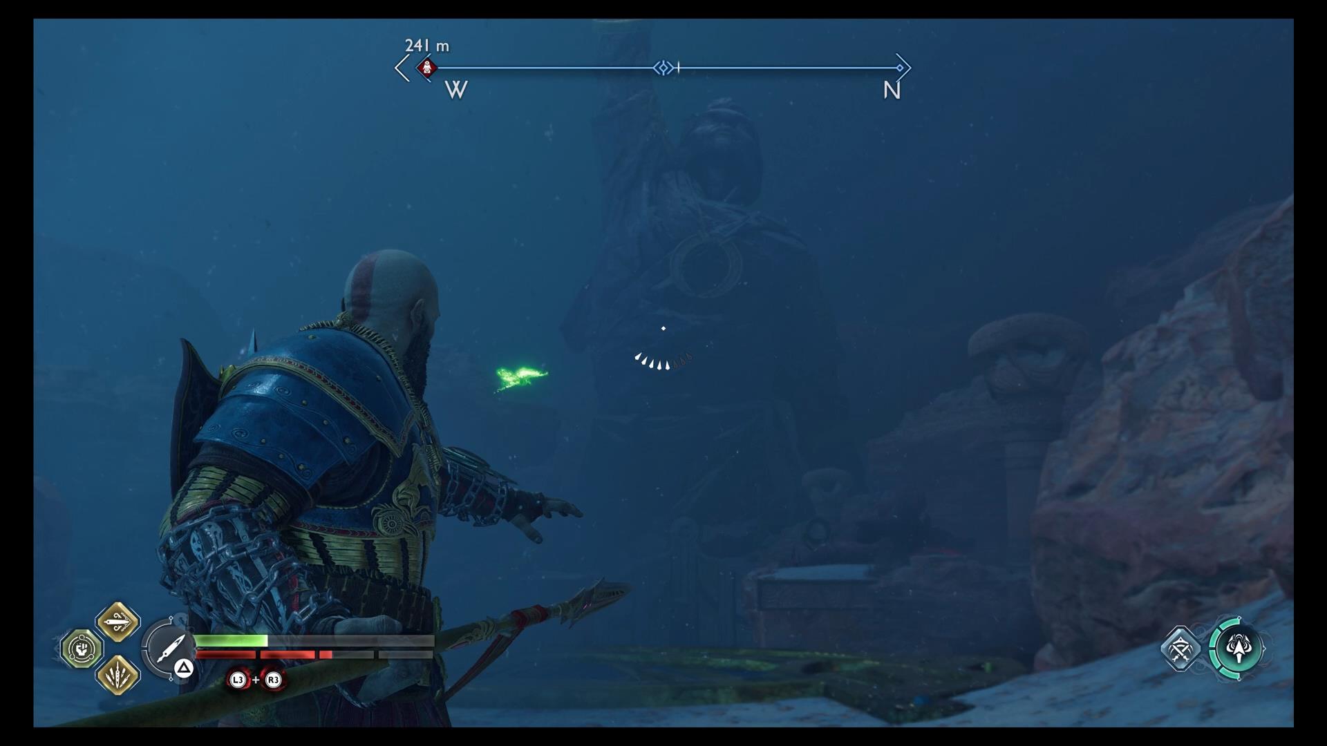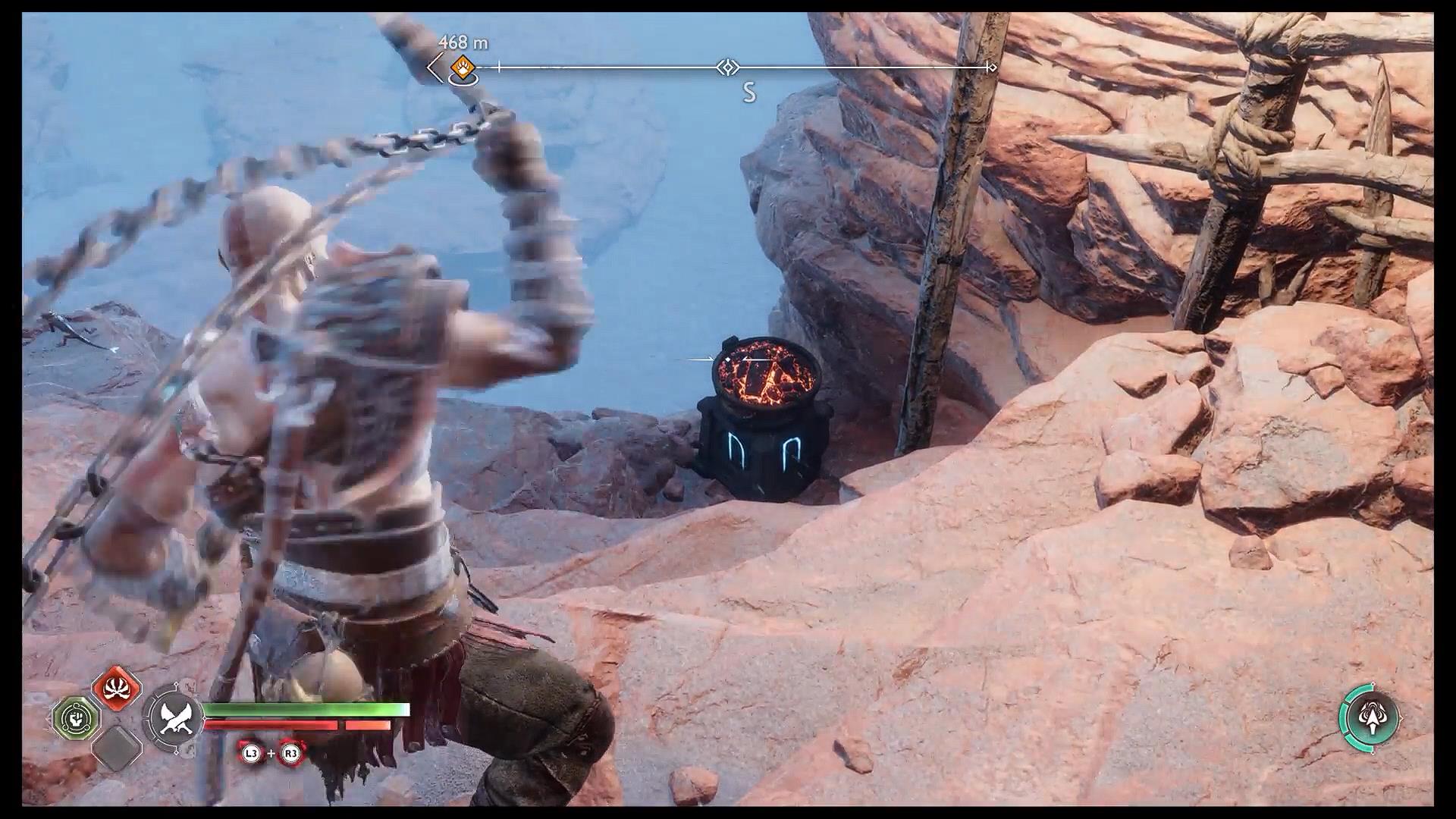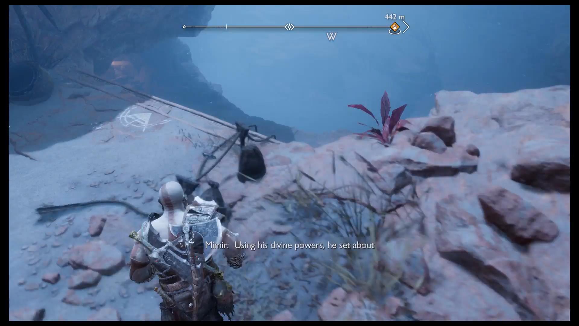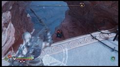 Jump down the ledges located just west of the Nornir Chest, and follow the path north. Use the spear to climb the ledge that you come across and continue until you can make a turn left (north).