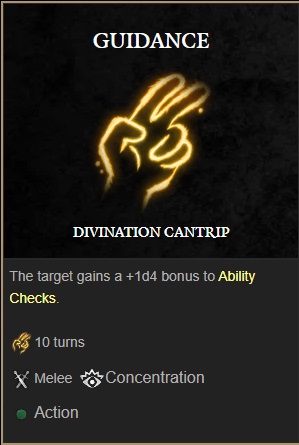 Outside of combat, there are so many uses for Guidance. In conversation, it gives a boost to any check, whether it’s Intimidation, Persuasion, Deception, etc. The Cantrip can be manually selected in any conversation, regardless of who initiates the conversation, or who has Guidance in their build. The boost can be fairly high, and allows passing checks that are much harder without it.